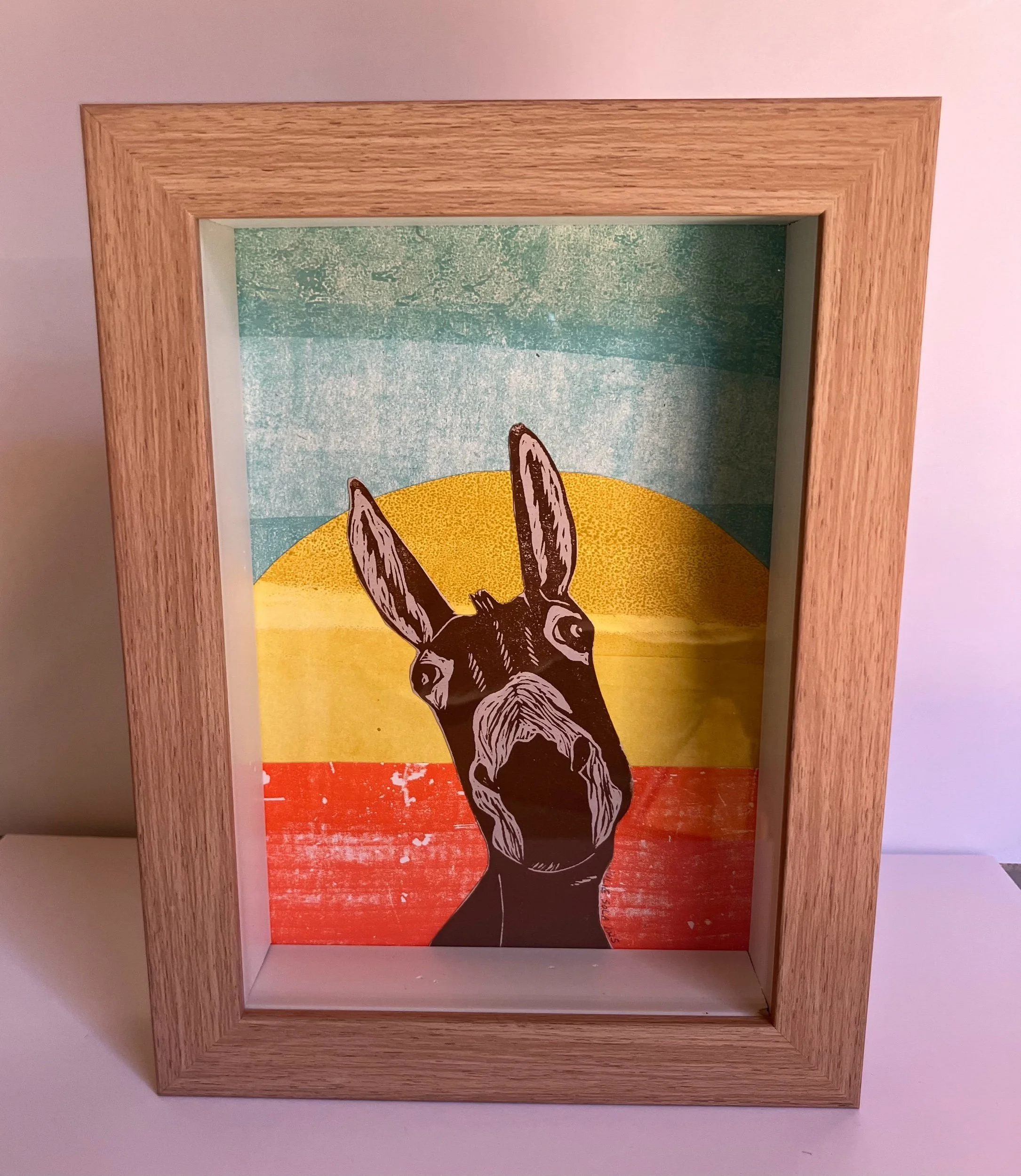 I make these collages using my hand pulled linoleum prints, this comes framed in a 5x7 shadowbox frame ready to hang in your wall.