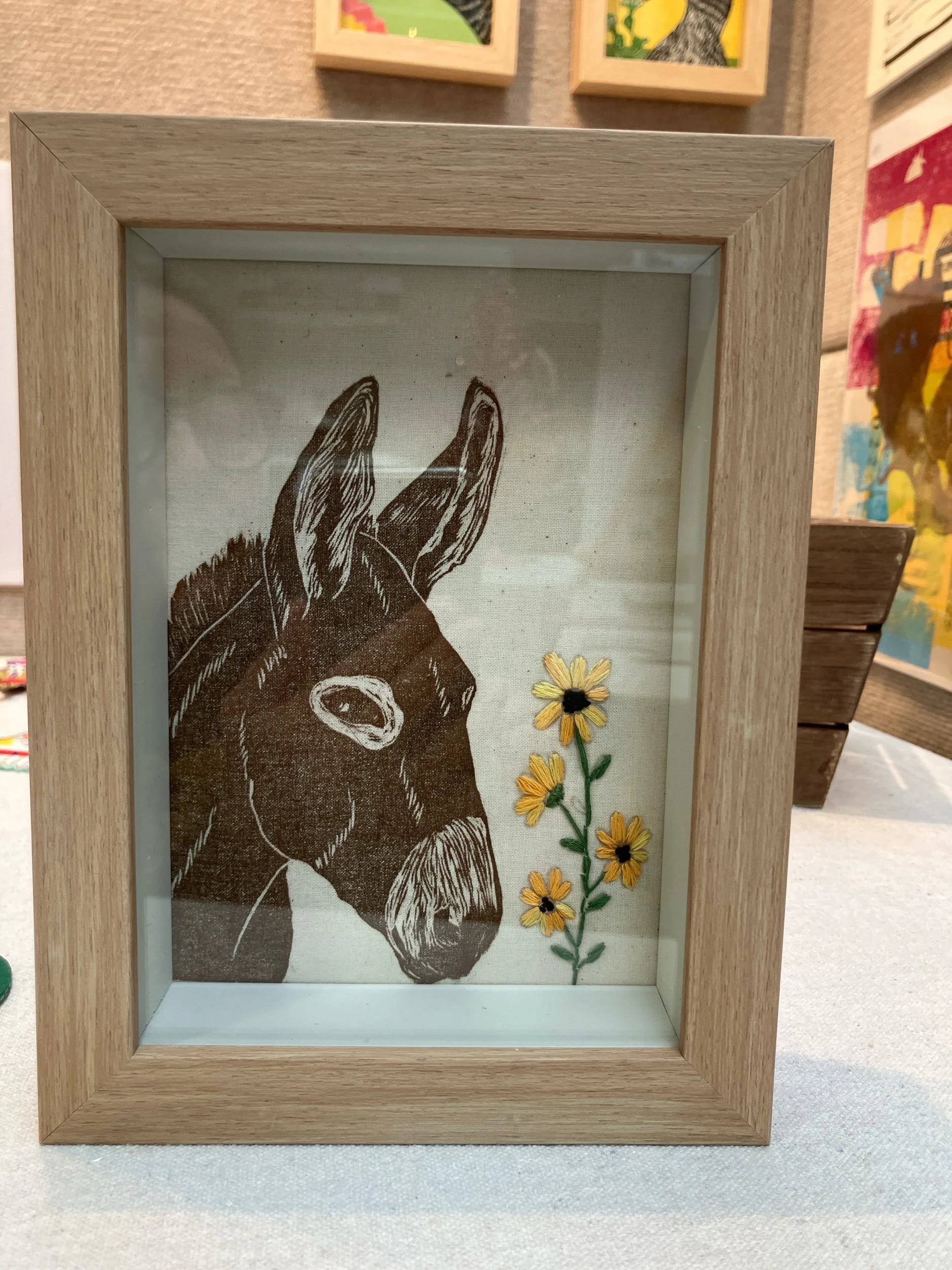 I hand print the burros onto muslin onto muslin, once it dries I hand it to my mom who embroiders the flowers. We have tried a few collaborations, this is the winner! I frame them in a 5x7 shadow box ready to hang on your wall.