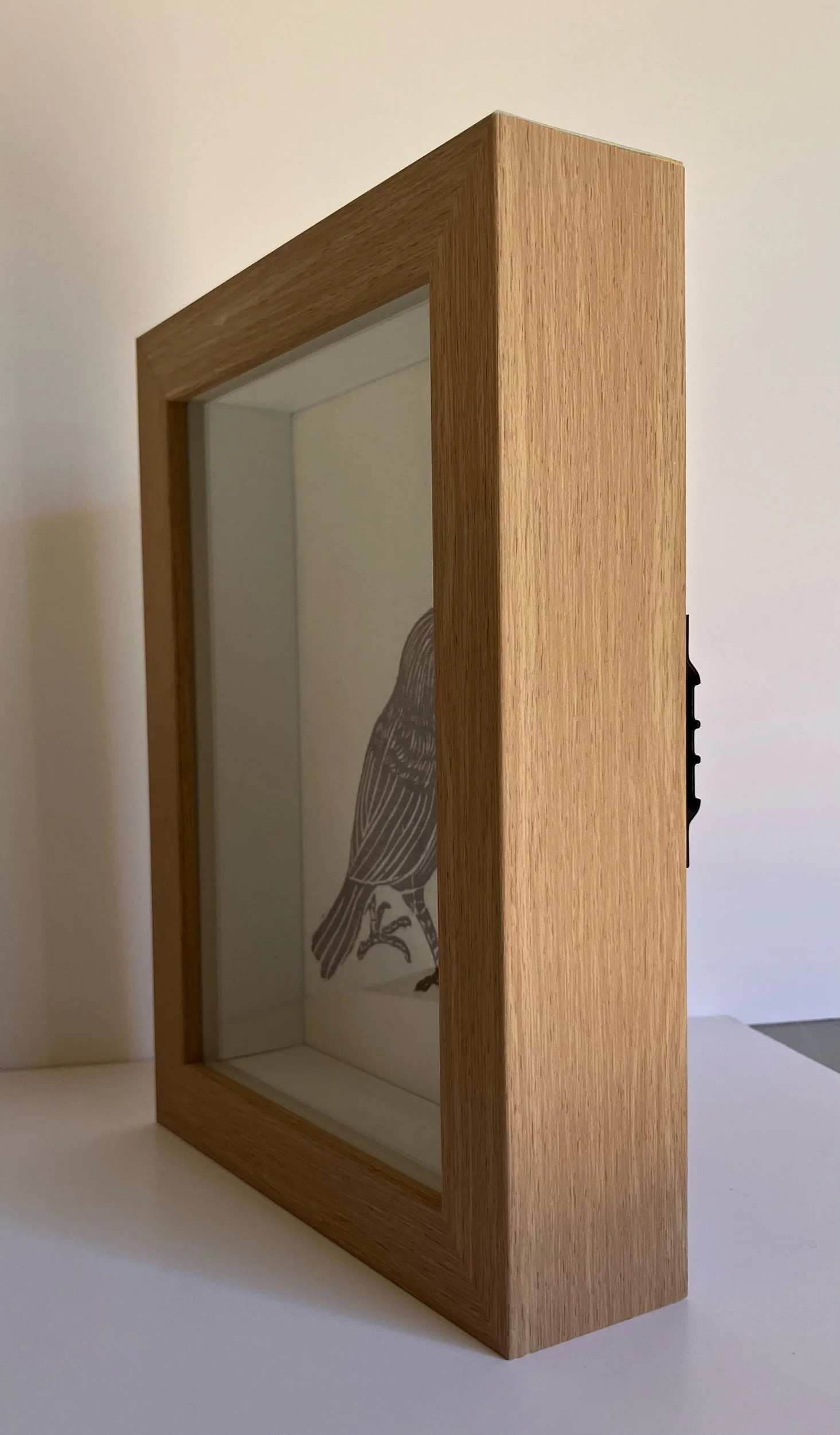 I hand print the image on muslin using my carved linoleum blocks, once it is dry my mom embroiders the flowers. I was trying to think of something we could do together and this is what I came up with. This collaboration has been so much fun. The piece comes framed in a blond wood 5x7 shadowbox ready to hang on your wall.