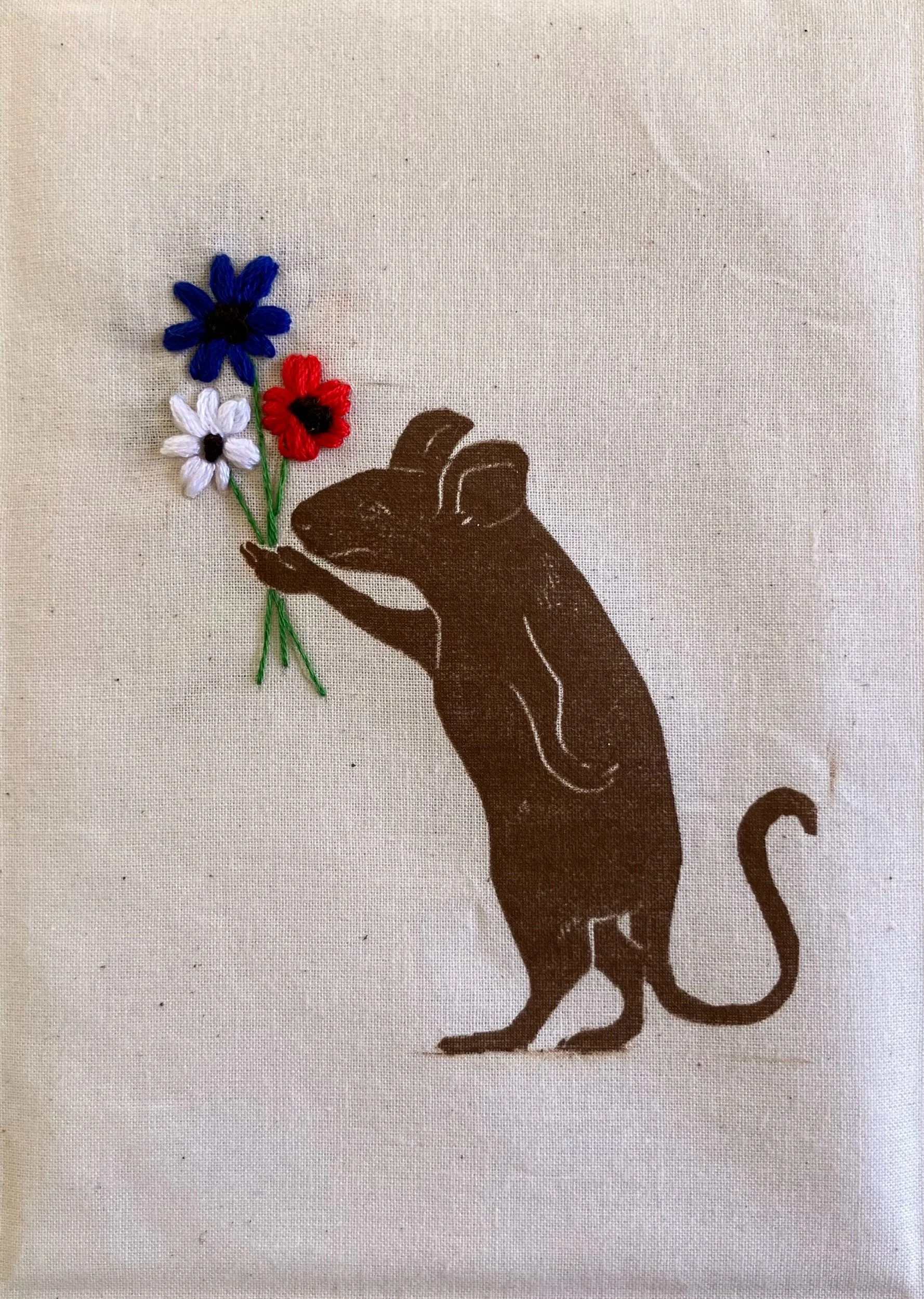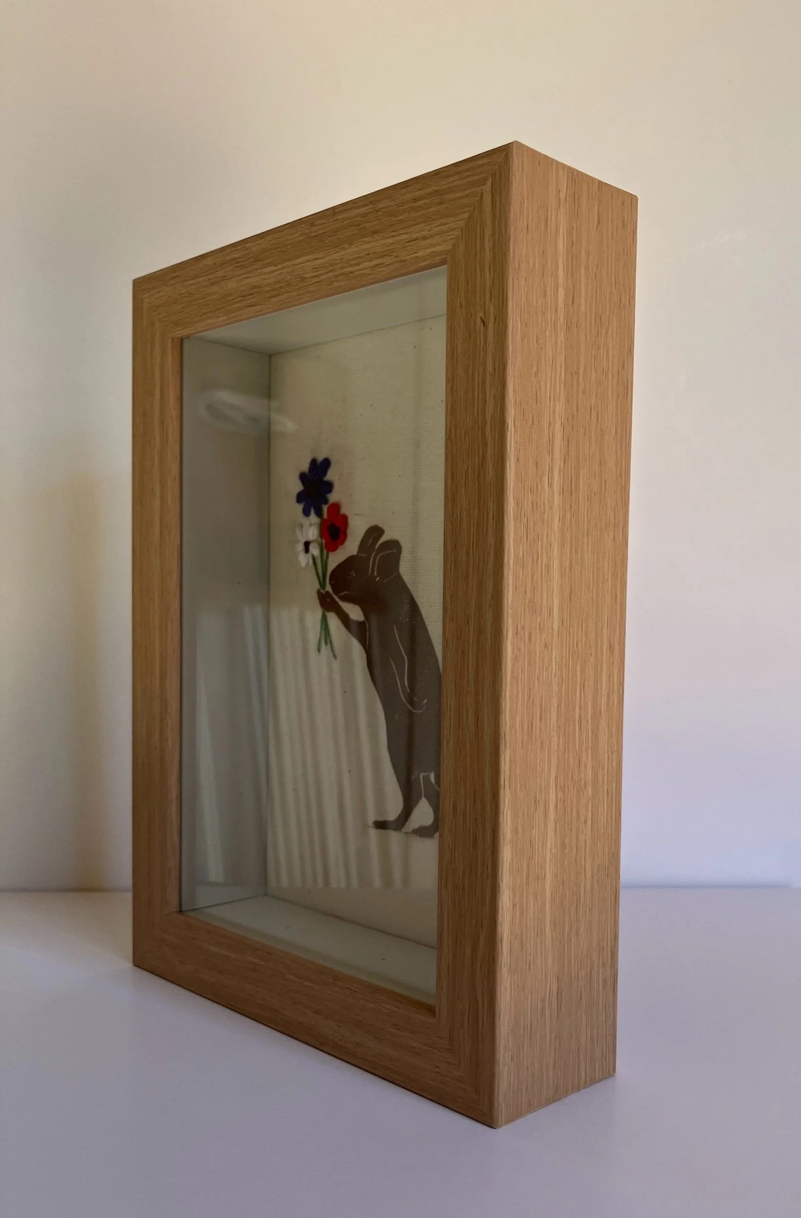 I hand print the image on muslin using my carved linoleum blocks, once it is dry my mom embroiders the flowers. I was trying to think of something we could do together and this is what I came up with. This collaboration has been so much fun. The piece comes framed in a  blond wood 5x7 shadowbox ready to hang on your wall.