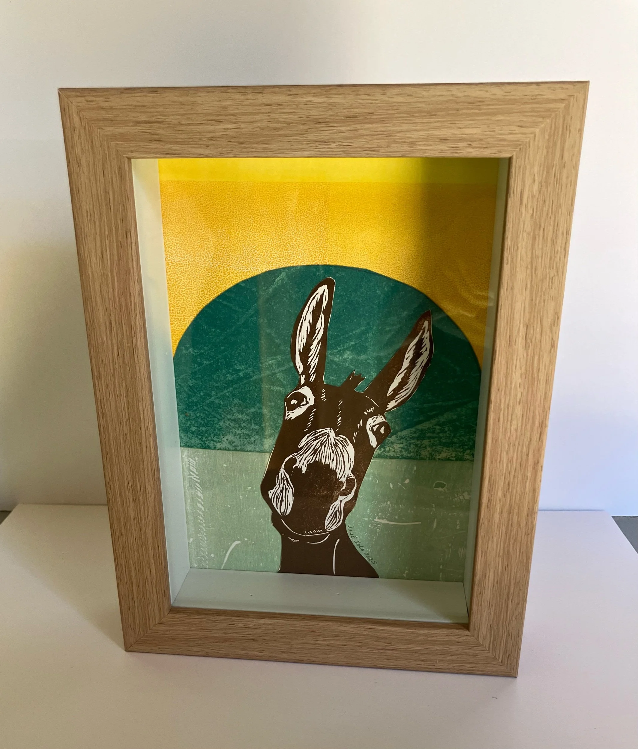 I make these collages using my hand pulled linoleum prints, this comes framed in a 5x7 shadowbox frame ready to hang on your wall.
