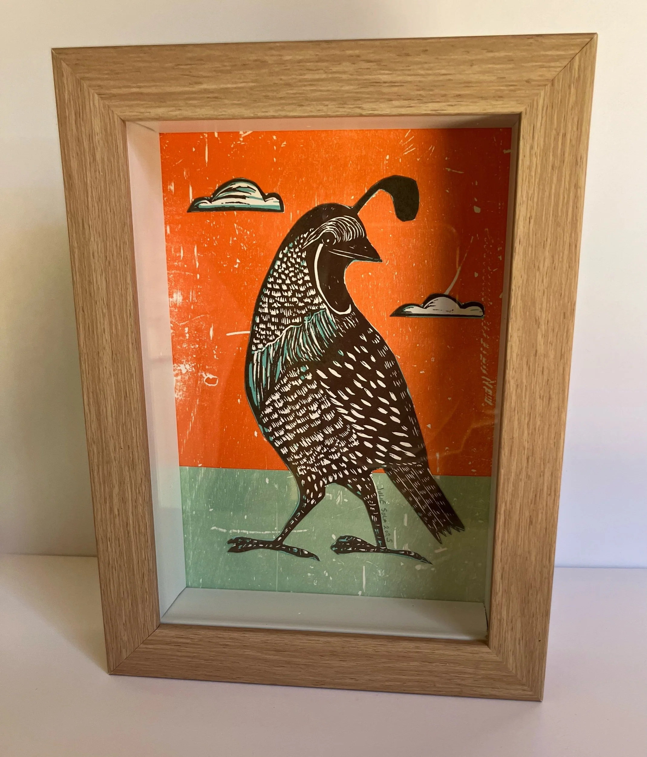 I make these collages using my hand pulled linoleum prints, this comes framed in a 5x7 shadowbox frame ready to hang in your wall.